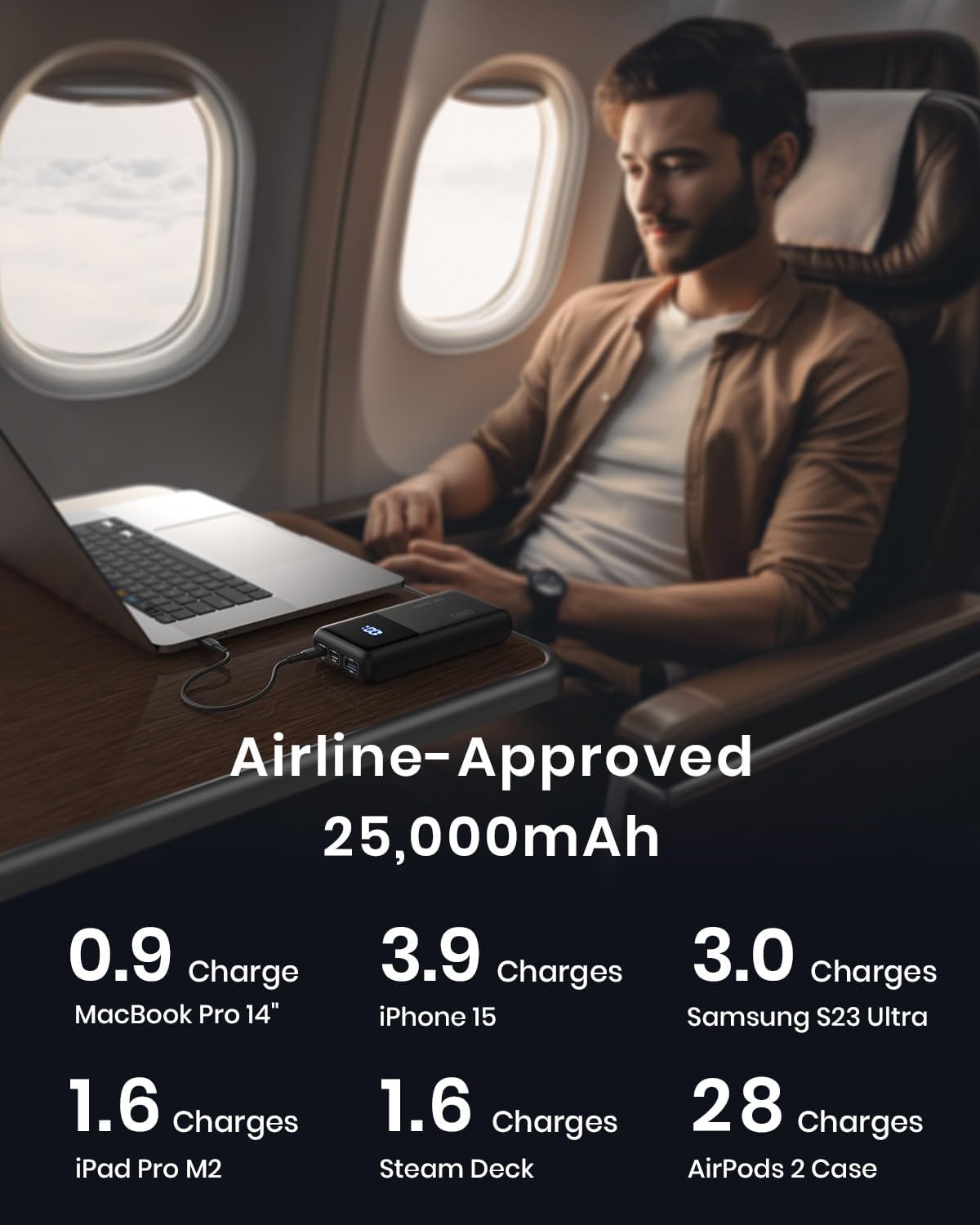 - [Air Travel Ready: 25,000mAh Capacity] Stay powered up during your travels with a substantial 25,000mAh battery capacity. It offers multiple device charges and is airplane-friendly for on-the-go power, making long flights and layovers a breeze.