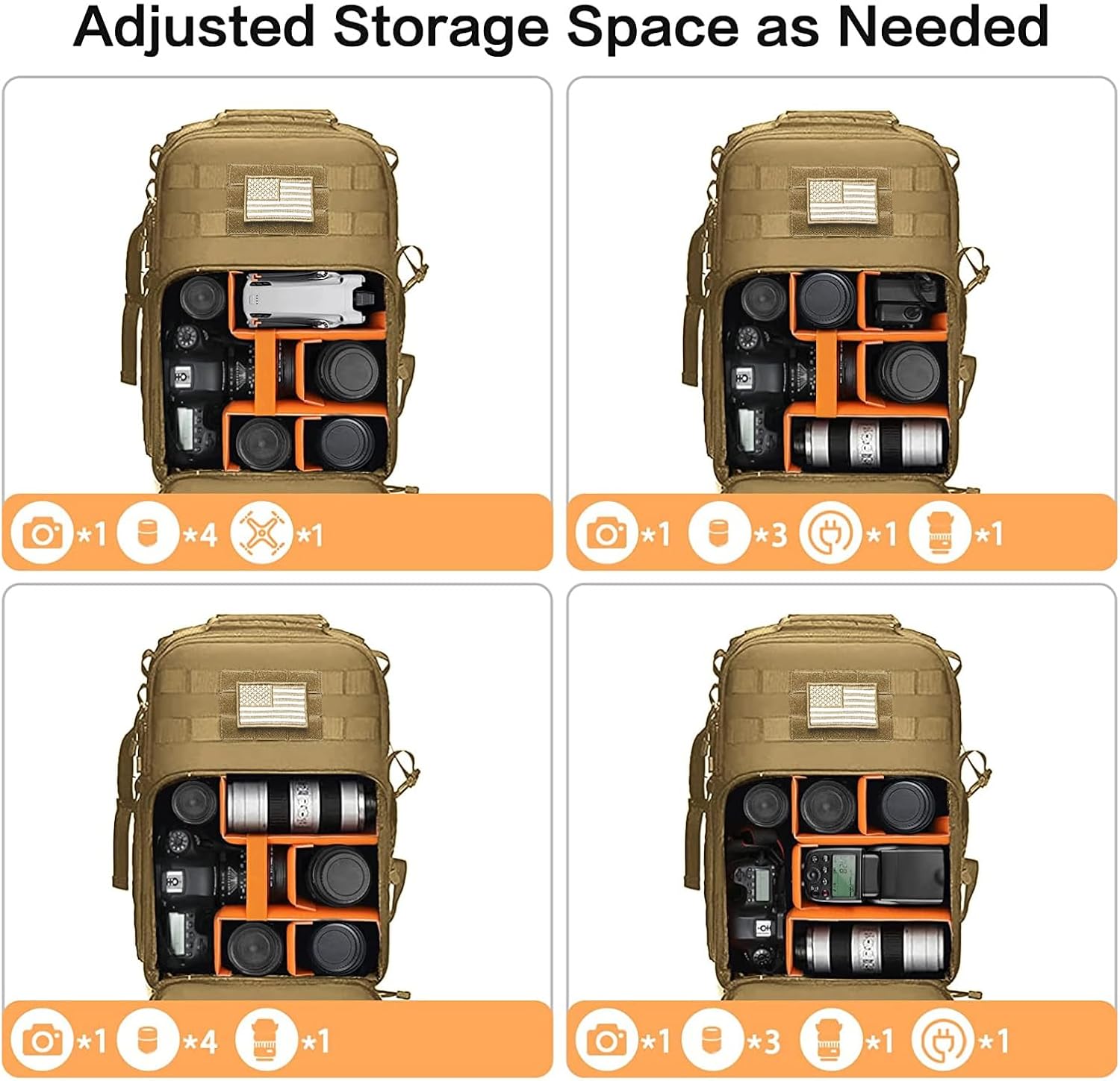 - Padded removable modular inserts in the lower compartment is designed as customized dividers for different cameras and camera equipment. Customer can adjust the space based on their needs. Compatible with Nikon D7100, D7200, D7500, D5600, D5300, D3500, D3400, D3300, D3200; compatible with Canon EOS Rebel T6, T6i, SL2, SL3; compatible with Sony Alpha A6000 A6100 A6300 A6400 A6500 A6600 A5100 and other standard-size DSLRs cameras. Also designed to be compatible with DJI Mavic Drone.
