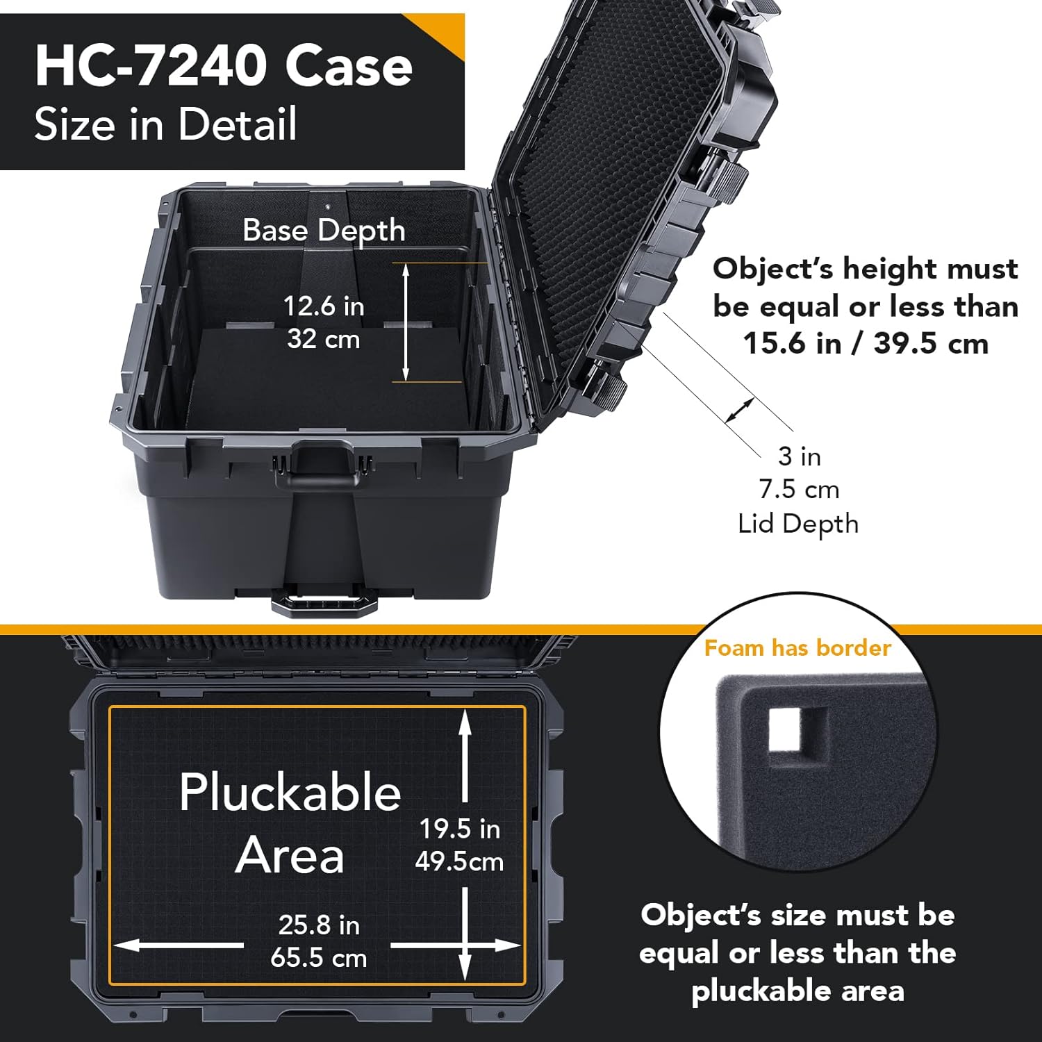 - Interior Size (if foam removed): 28.3x21.6x15.6 inch / 72x55x39.7 cm | Usable Foam Size (with foam): 25.8x19.5x15.6 inch / 65.5x49.5x39.5 cm