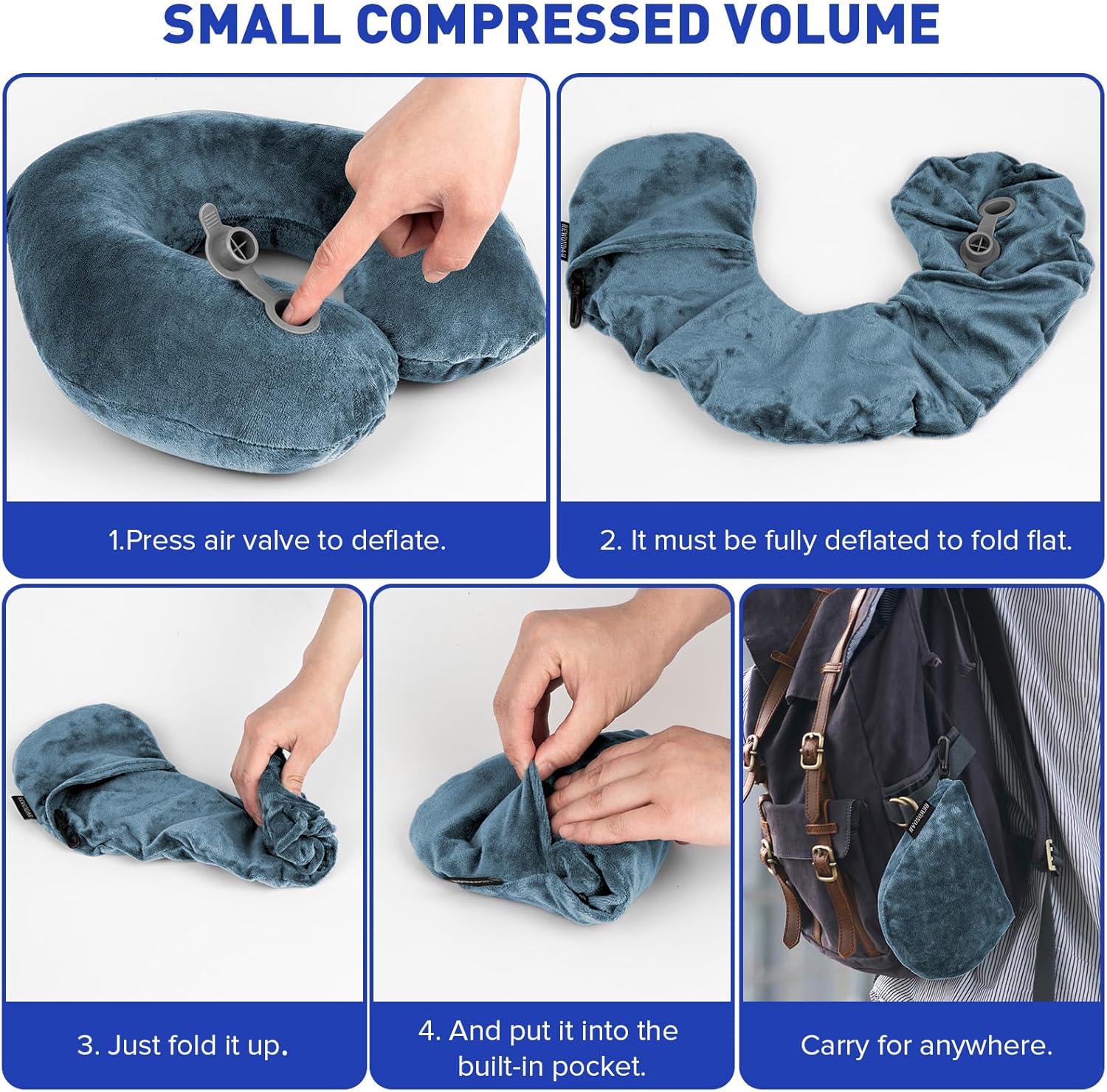 - ✈Ultra Small Space: The travel pillow inflatable is lightweight and very compact. And the storage bag is cleverly designed. When deflated, you just fold the neck pillow into the built-in pocket that is part of the pillow so no worry about losing the storage bag. It also has a small clip so you can attach it to any travel backpack or luggage. You can take the inflatable travel pillow with you wherever you go.