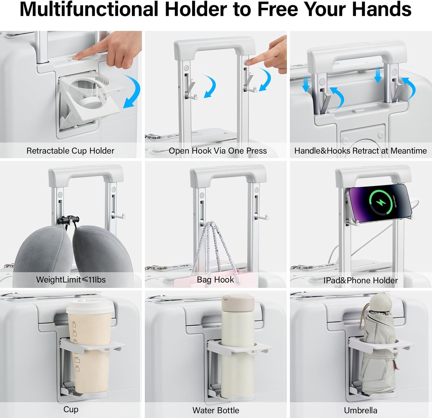 - 【Multifuctional Holder】This carry on with cup holder is convenient to place drinks, water bottle, etc. And amazingly the hard case luggage has a phone/IPAD holder on the handle and it also be as a hook while traveling to hang your bag, U-shaped pillow.