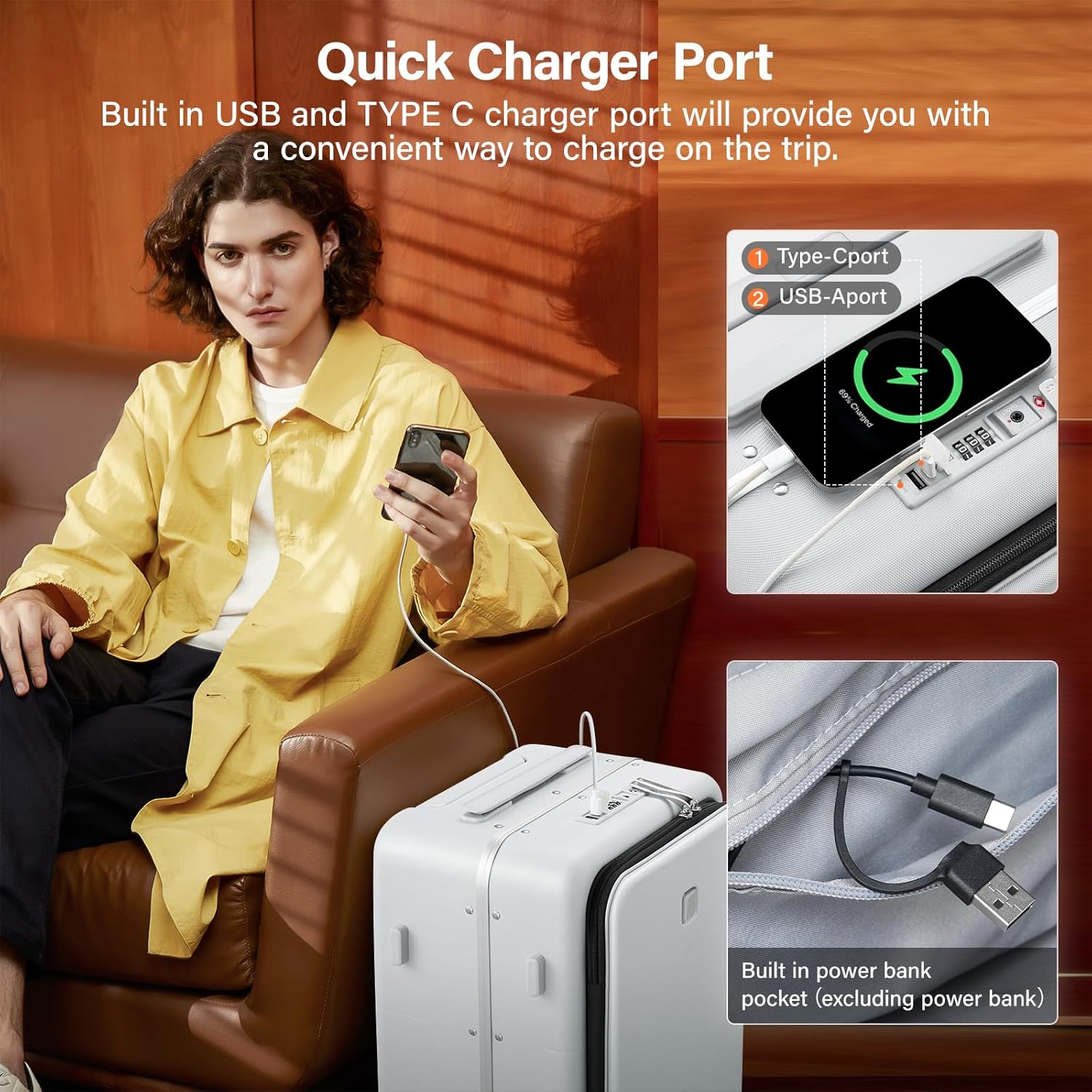 - 【Quick Charger Port】This carry-on luggage with charger built in USB and TYPE C charger port,you only need to connect the power bank to the cable in the pocket inside and the travel suitcase will provide you with a more convenient way to charge your electronic devices on the trip.