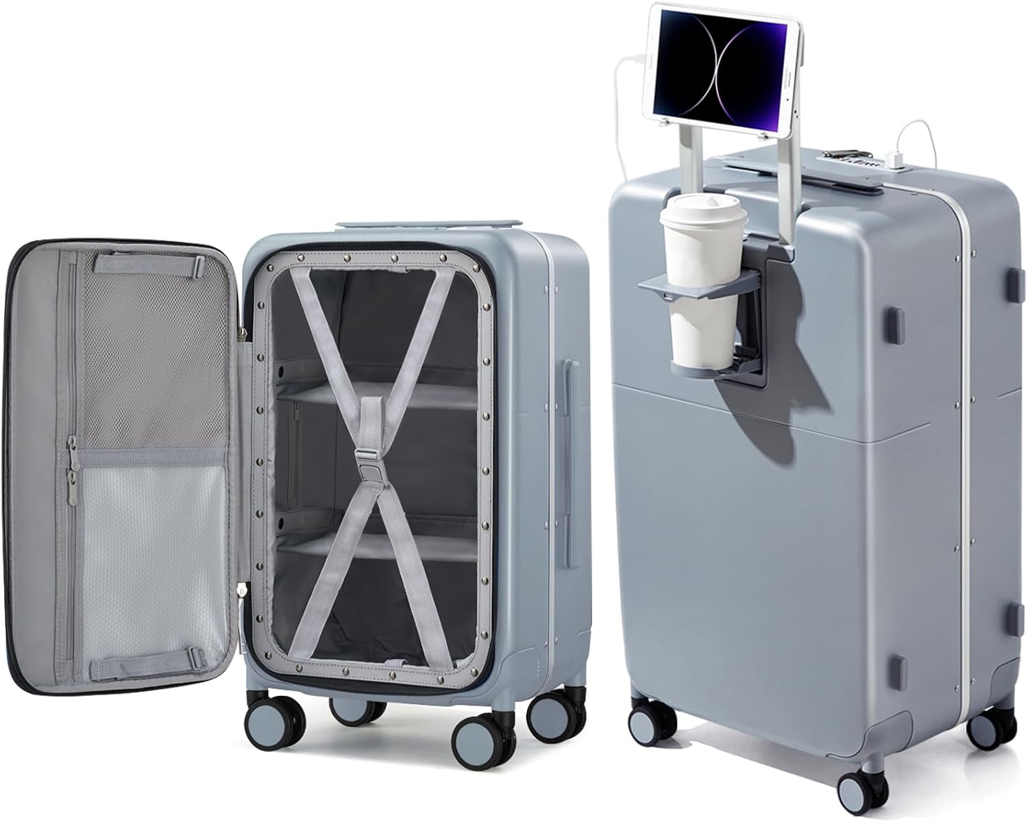 Hanke 28 Inch Luggage with Cup Holder and Charge,Top Opening Hard Shell Suitcases with Wheels and Dividers,Aluminum Frame Trunk Luggage Extra Large Suitcase with Lock for Travel,Gray