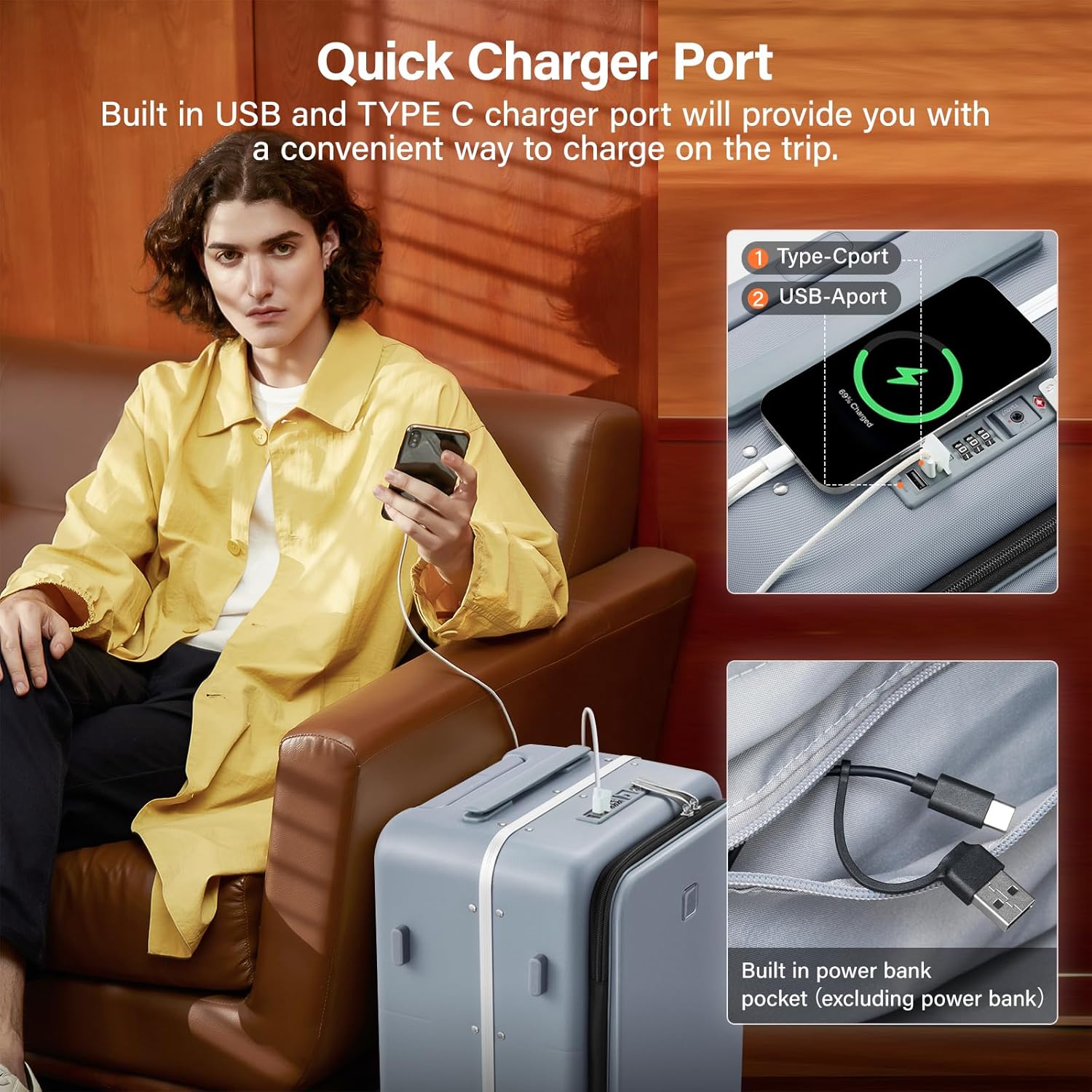 • 【Quick Charger Port】This large luggage with charger built in USB and TYPE C charger port,you only need to connect the power bank to the cable in the pocket inside and the travel suitcase will provide you with a more convenient way to charge your electronic devices on the trip.