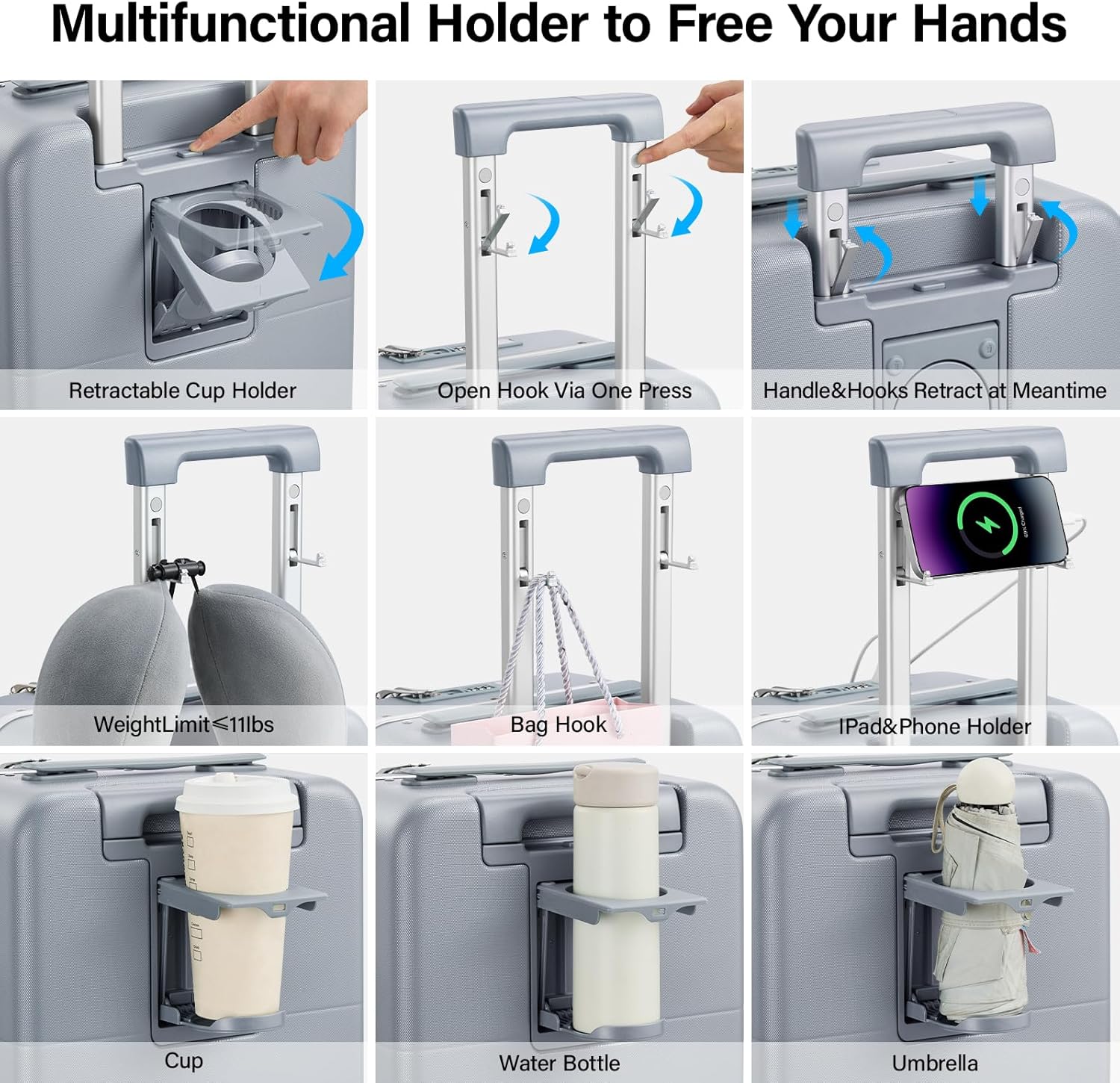 • 【Multifuctional Holder】This suitcase with cup holder is convenient to place drinks, water bottle, etc. And amazingly the hard case luggage has a phone/IPAD holder on the handle and it also be as a hook while traveling to hang your bag, U-shaped pillow.
