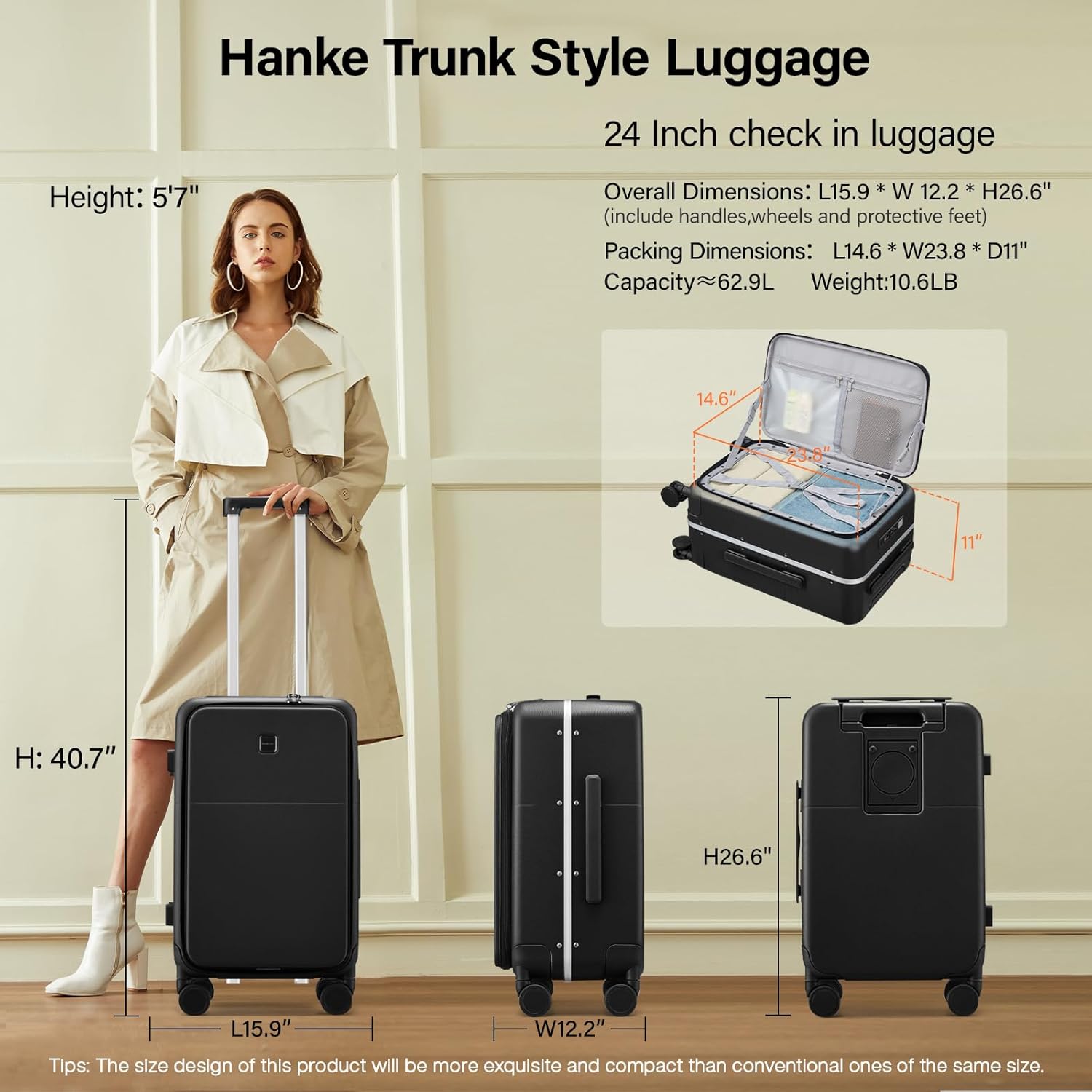 Hanke 24 Inch Luggage with Cup Holder and Charge,Top Opening Hard Shell Suitcases with Wheels and Dividers,Aluminum Frame Trunk Luggage Medium Checked Suitcase with Lock for Travel,Jet Black