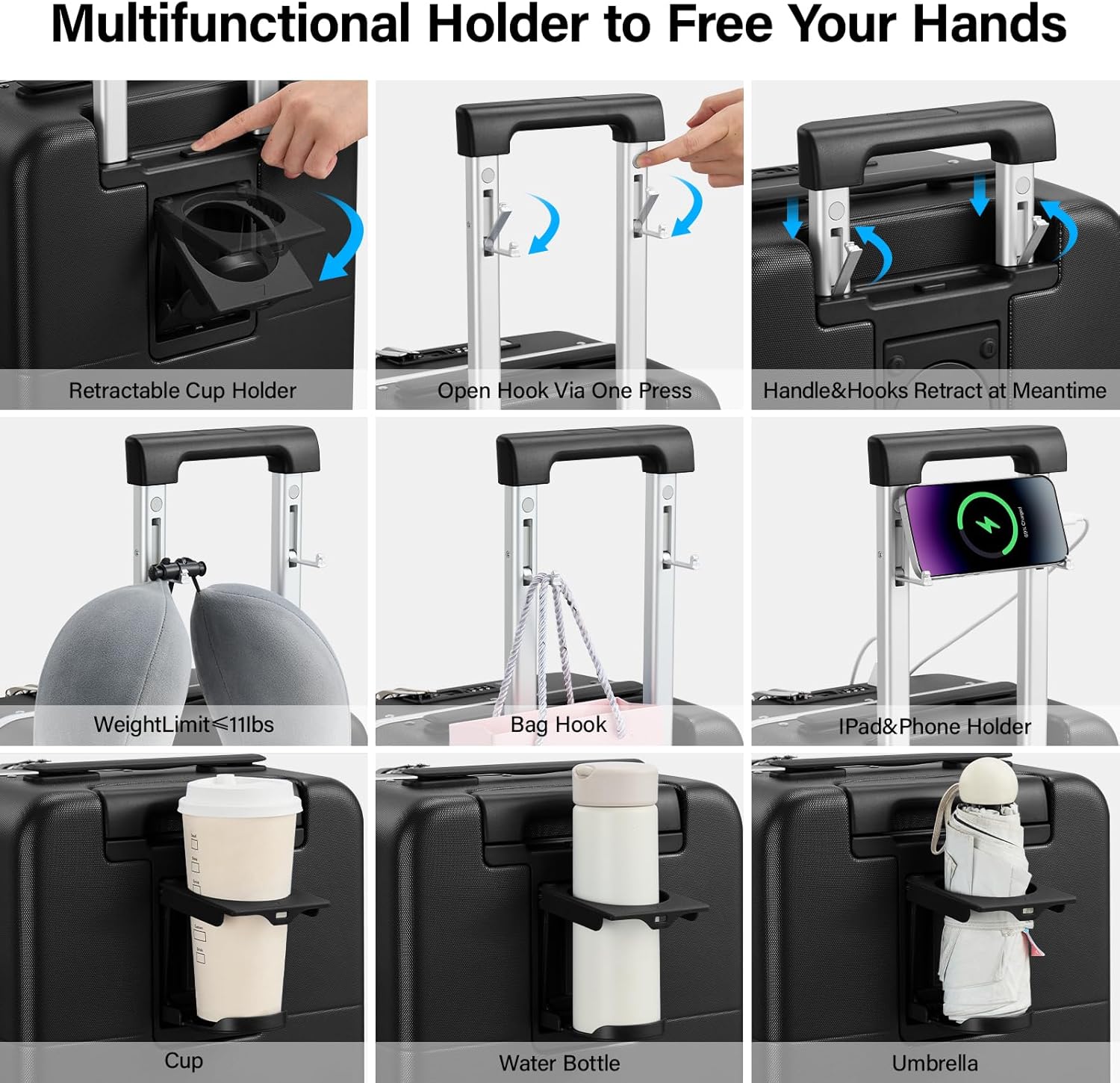 - 【Multifuctional Holder】This suitcase with cup holder is convenient to place drinks, water bottle, etc. And amazingly the hard case luggage has a phone/IPAD holder on the handle and it also be as a hook while traveling to hang your bag, U-shaped pillow.