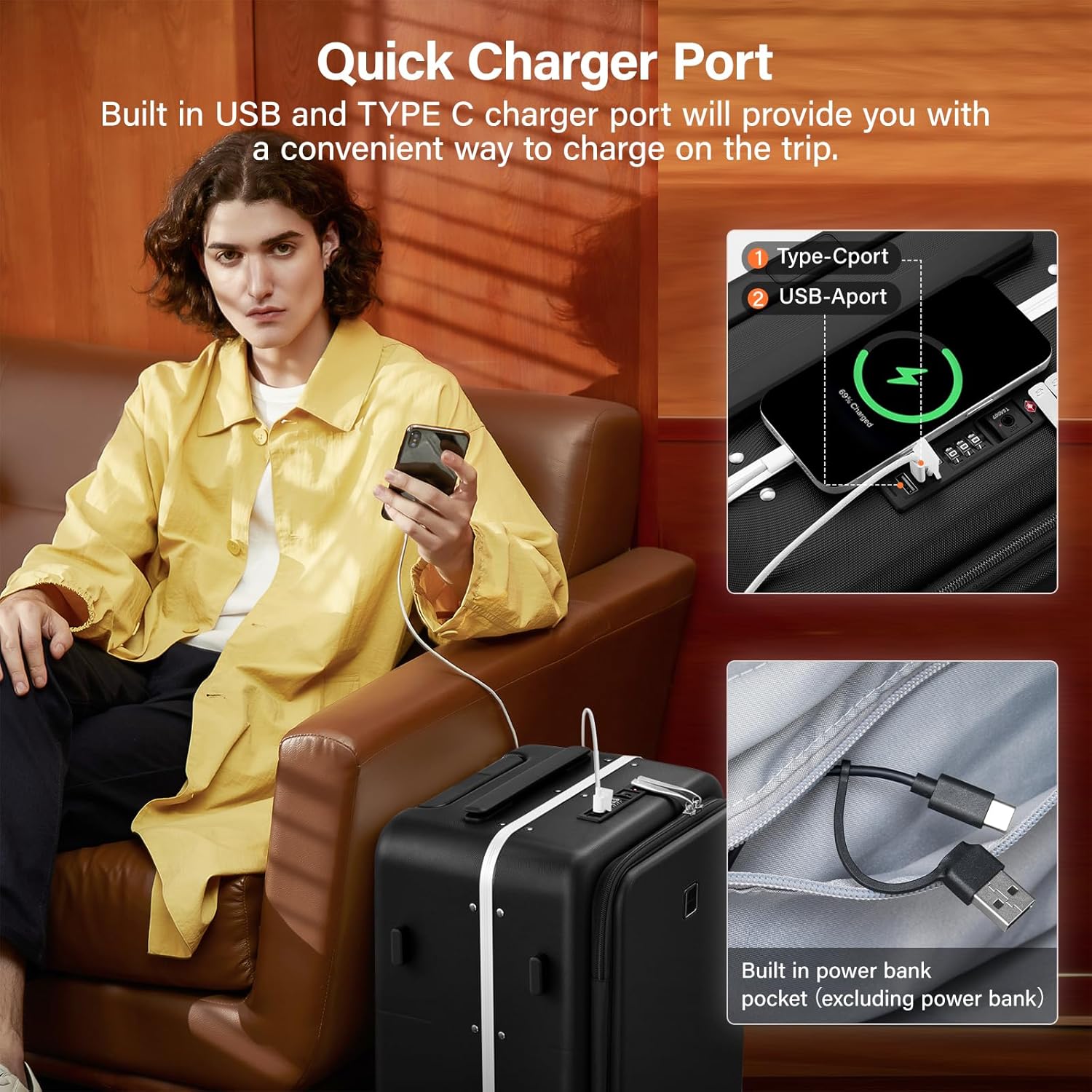 - 【Quick Charger Port】This medium luggage with charger built in USB and TYPE C charger port,you only need to connect the power bank to the cable in the pocket inside and the travel suitcase will provide you with a more convenient way to charge your electronic devices on the trip.