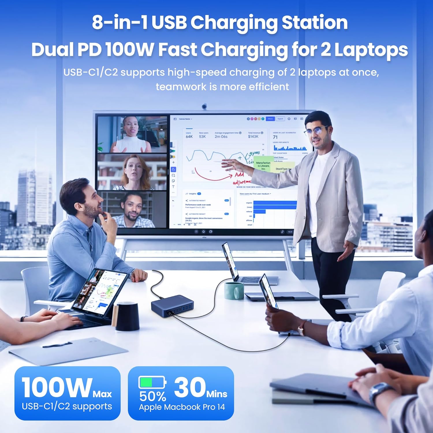 - ăUSB C Laptop Charger Fast-Speed Chargingă It with total 415 watt power,Our charger has 8 ports, 5 USB C ports and 3 USB A ports, it compatible with all USB devices.Our feature is that our C1 and C2 single interface output is 100W, and we can charge two computers and 6 other devices at the same time.USB C Charger Compatible with iPhone Series ,Samsung Phones,Smartphone, Tablet, and Laptop, Work For MacBook Pro 13''/ MacBook Pro MacBook Air MacBook etc
