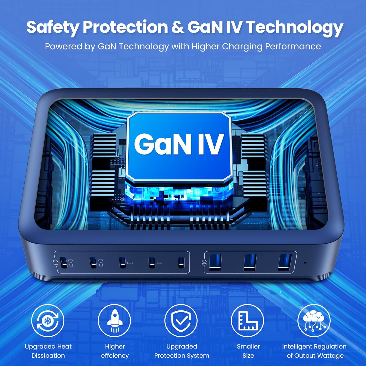 USB C Charger 415W USB C Charger Block, 8-Ports GaN IV Fast Charging Station Hub,Dual PD 100W Laptop Charger Adapter,for MacBook Pro/Air/iPad/iPhone16/15/14/13/Apple Watch/DELL/Samsung for Home(Blue)