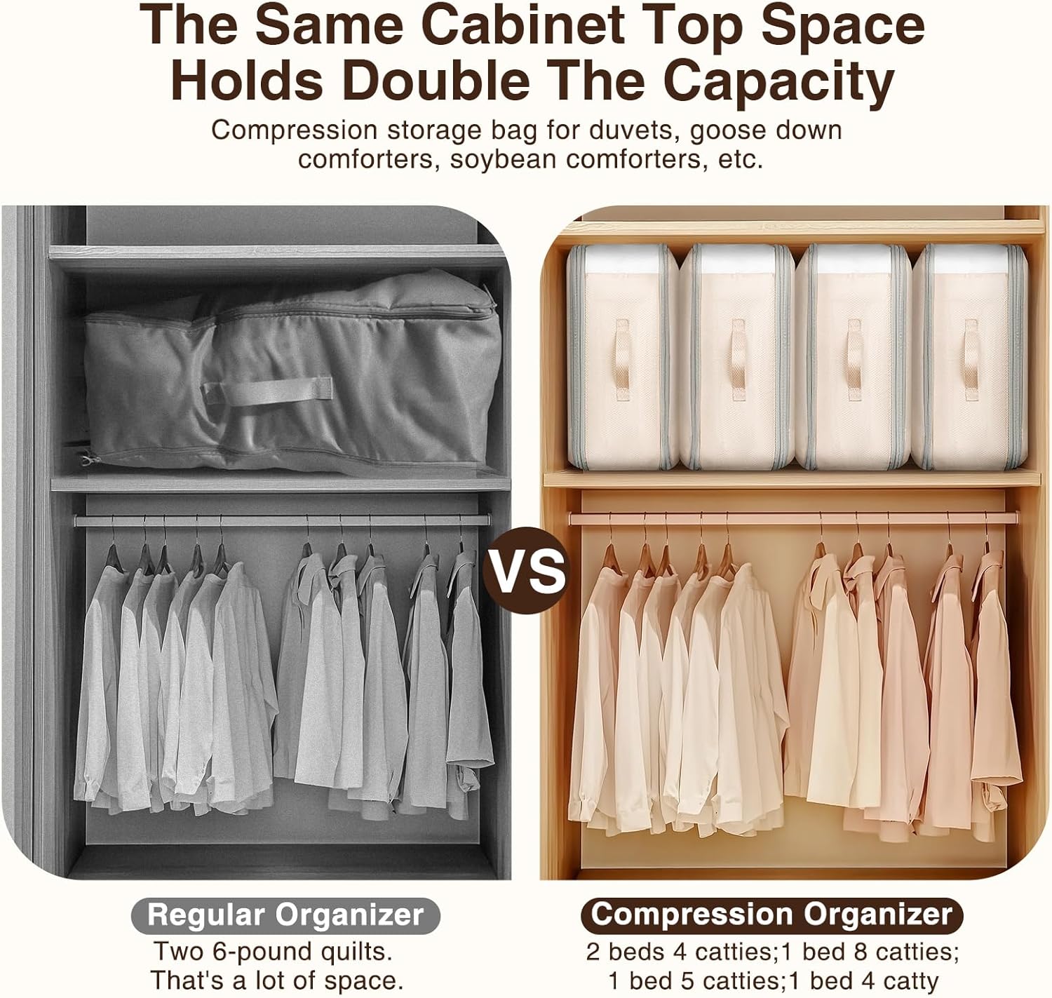 - [Large-Capacity Versatile Storage]: These compression clothing storage bags are ideal for storing comforters, blankets, winter coats, down jackets, sweaters, pillows, bed sheets, towels, scarves, and even seasonal clothing, adapting to all your storage needs. From bulky duvets to lightweight quilts, they accommodate a wide range of items. The ultra space saving self compression design maximizes closet or under-bed space, keeping everything compact, organized, and protected