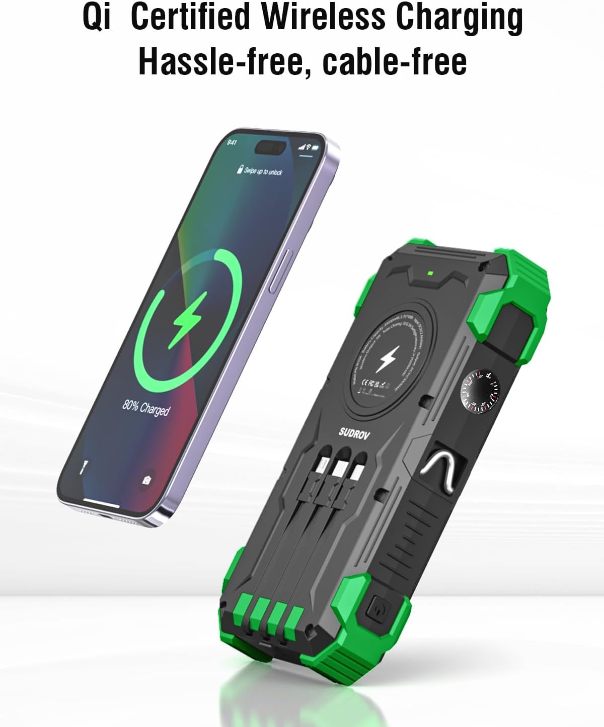 - 【Built-in 4 Charging Cables】This solar charge power bank features 3 built-in output cables (Type C, Lightning, and Micro USB) and 1 USB-A input cable, so you never need to carry extra cables. Enjoy hassle-free charging at home, work, or on the go. Simplify your life by eliminating tangled wires and always having the right cable at your fingertips. Charge anytime, anywhere with ease.