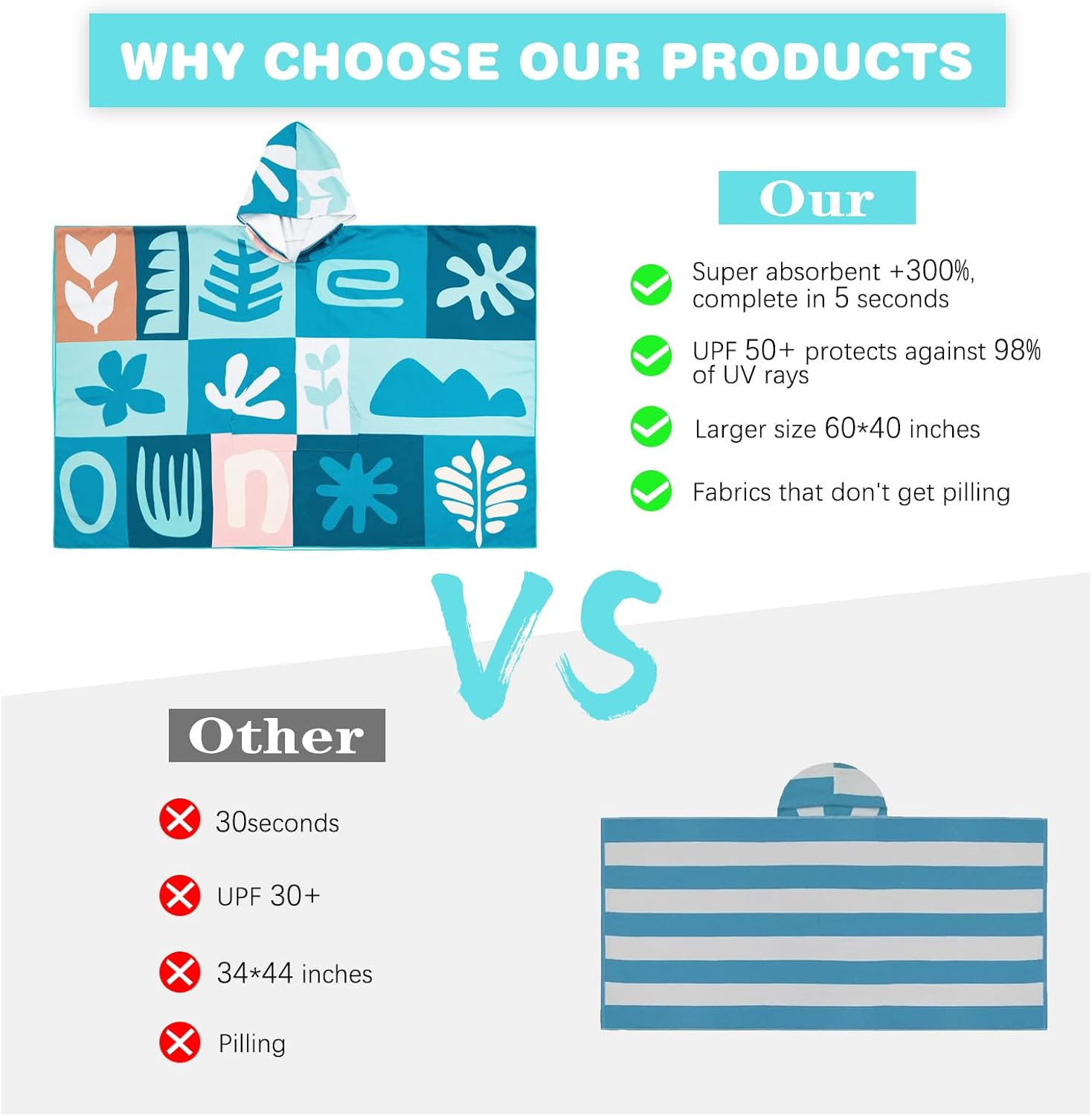 - All-day multi-use companion: Wearable poncho style (60"x40") with hood converts from quick-dry bath wrap to sun shield, picnic blanket, or emergency rain cover - 6 uses in 1 smart design