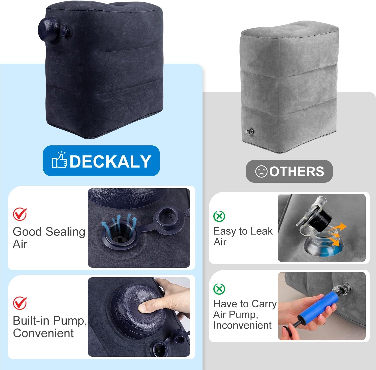- 【EASY INFLATION & DEFLATION】 because of the upgrade design of attaching pump the pillow, our airplane footrest pillow can be inflated and deflate quickly with hand pressing in 1 minutes, no more blowing by mouth or using separate air pump!