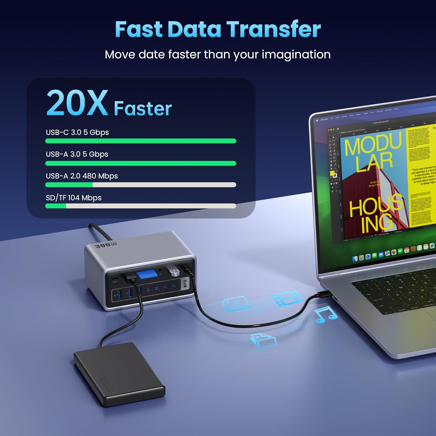 - 【20-in-1 300W USB Docking Station Huge Expansion】The all-in-one USB C docking station meets all your expansion needs, transforms your laptop into a high efficience workstation with ease! With this usb c hub multiple adapter, you'll get 100W PD USB-C port for laptops, 7 USB ports (3 QC USB-A + 4 USB -C) sharging 200W of power, 3 USB data ports support 5Gbps max data transfer, SD/TF card slots, 3.5mm Audio, VGA, 2 x 4K HDMI, DisplayPort, Gigabit Ethernet, AC power input with 1.5ft charging cord.