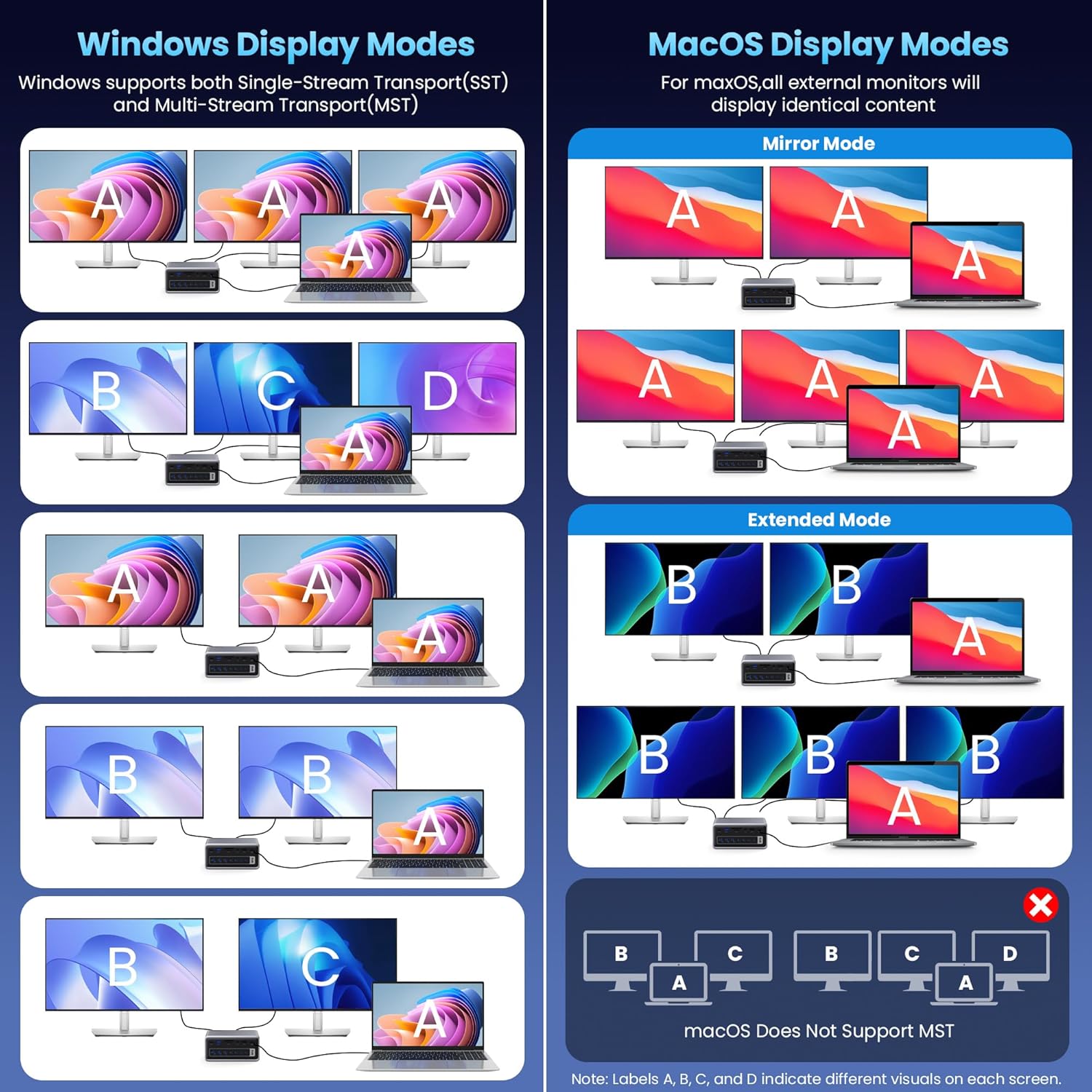 - 【Triple Display Dual 4K Docking Station】Extend workflows across 3 external monitors (2 x 4K HDMI + DP @ 4K 60Hz + VGA @ 1080p) for immersive multitasking. Quad-screen mode (laptop + 3 externals) boosts productivity for designers, traders, and gamers. Note: Only Windows System support MST and SST(Mirror & Extend Mode); MacOS only support Single-Stream Transport (SST) mode, which means all connected monitors will show the same content.